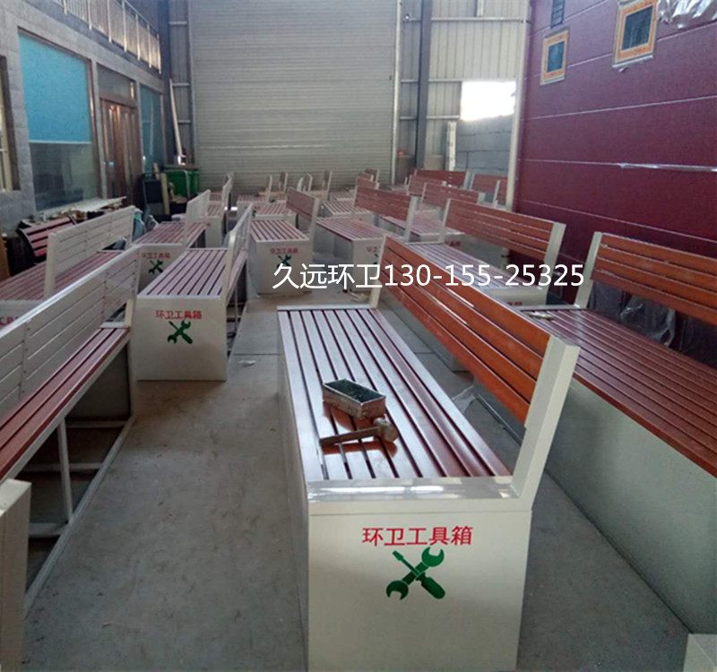 環(huán)衛(wèi)工具箱:也叫保潔員工具箱,環(huán)衛(wèi)工具椅,保潔員休息座椅,市政保潔箱等。工具箱常用尺寸為:長2400*寬500*高550mm,也可以做成2米,2.4米,2.7米等,寬度和高度也可以定做,滿足不同客戶、不同場所的使用要求。